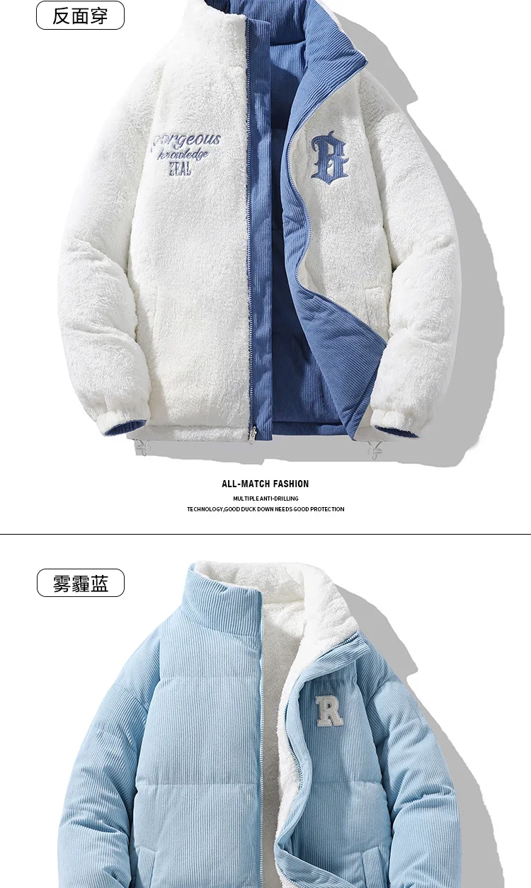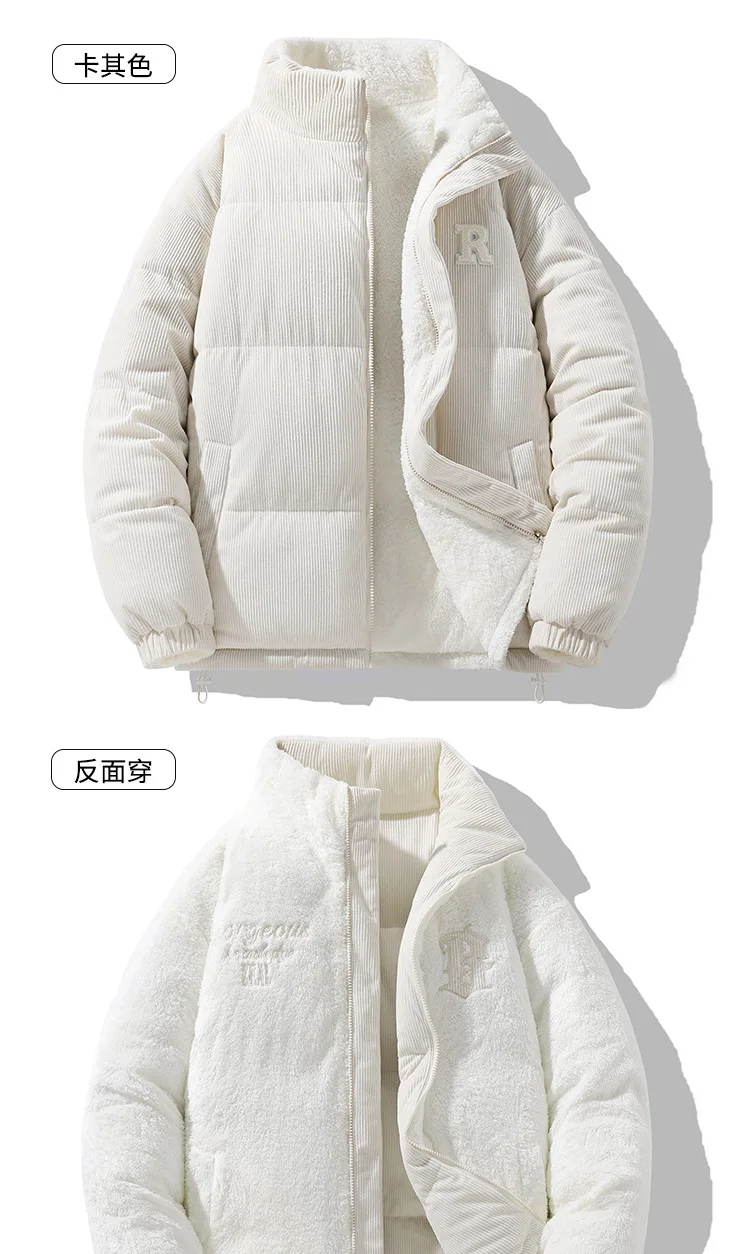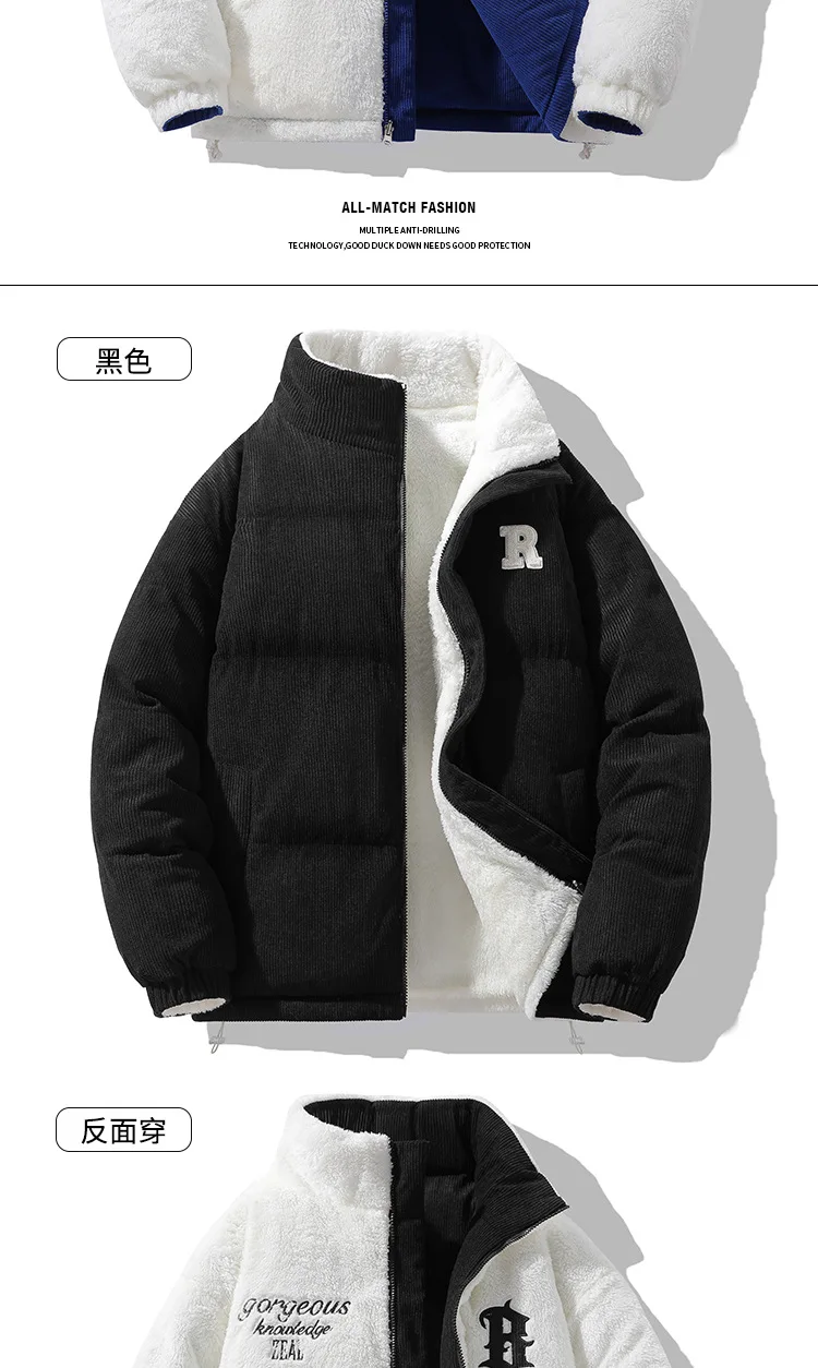 New Winter Men Reversible Corduroy Down Jackets Stand Collar Warm Parkas Fashion Male Casual Thicker Coats Man Slim Jackets 3XL